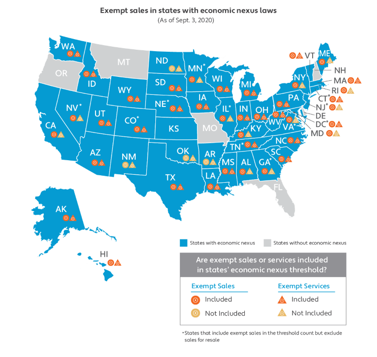 Some state economic nexus thresholds are based on retail sales; in these states, exempt sales are generally excluded from the threshold count. States basing the threshold on gross sales typically include exempt sales in the threshold, though some may exclude sales for resale. Yet generalizations should be avoided because each state’s economic nexus threshold is unique.