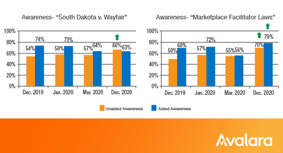 Unaided awareness of marketplace facilitator laws grew across all subgroups from December 2019 to December 2020: