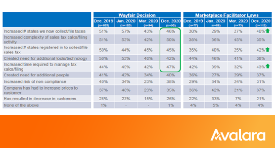 Of companies surveyed in December 2020, 40% said they were currently collecting and filing taxes in more states than previously because of marketplace laws. Similarly, marketplace laws compelled 42% of companies surveyed to register in more states, and 43% to spend more time managing tax collection and remittance.