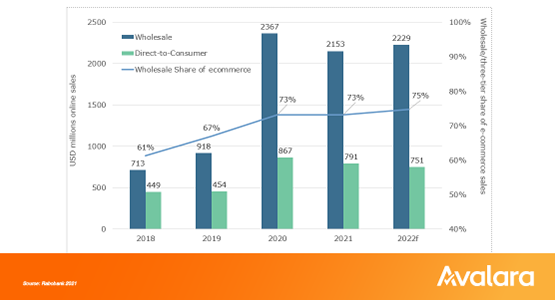 The primary ecommerce categories within the wholesale channel all experienced impressive growth between 2019 and 2021. Here are Rabobank’s numbers: